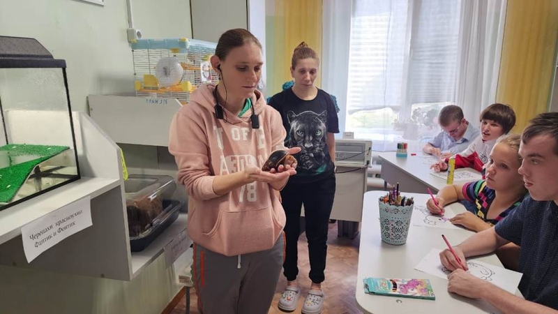 Участники мероприятия смогли познакомиться с удивительными обитателями нашего "островка". В кабинете живут волнистые попугаи, которые радуют своим ярким оперением и весёлым щебетом. Также здесь можно встретить игривых хомяков, фантастических красноухих черепах и интересную улитку ахатину.