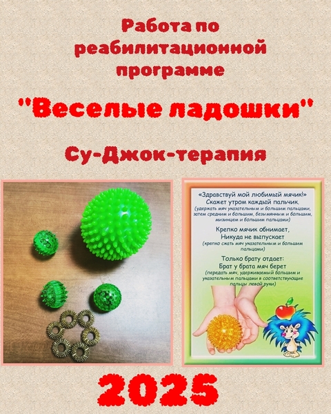 Наряду с традиционными упражнениями и пальчиковыми играми, в рамках программы "Весёлые ладошки" используемся и су-джок-терапия. Этот метод направлен на нормализацию мышечного тонуса (который как правило нарушен у людей с речевой патологией) и улучшение психоэмоционального состояния. Игровой самомассаж проводится с использованием массажных мячей и эластичных колец, для наших проживающих с тяжёлой умственной отсталостью и заболеванием ДЦП. Работа проводилась в индивидуальной форме, так и подгруппами.