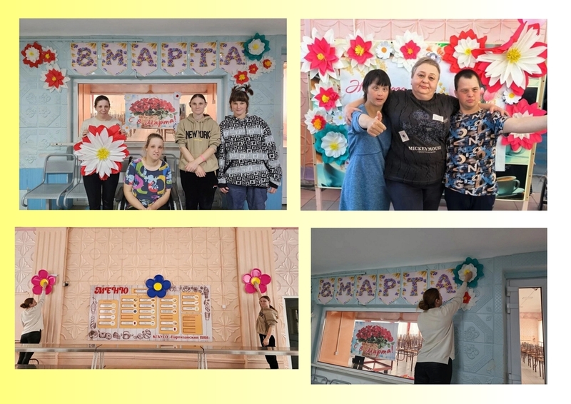 В преддверии Международного женского дня сотрудники и проживающие интерната украсили интерьер учреждения. Холл и столовая были нарядно декорированы ко Дню весны и красоты. Атмосферу праздника поддержали цветами, воздушными шарами и тематическими украшениями.