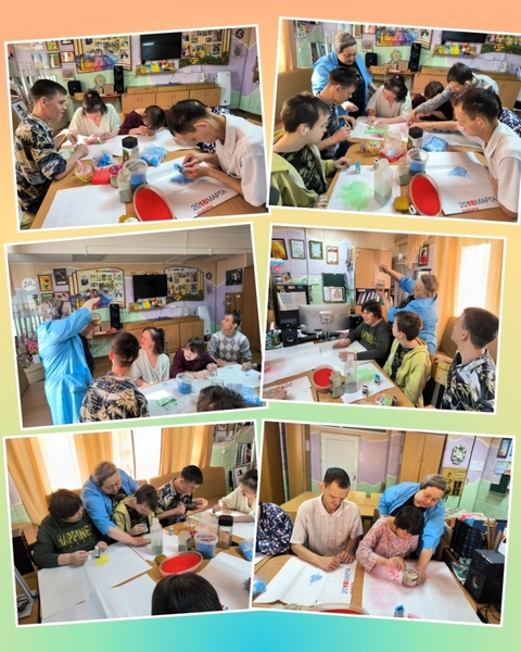 С руководителем кружка Ермаковой О.В. наши проживающие с тяжёлыми формами умственной отсталости освоили технику окрашивания соли мелками, создавая яркий и необычный материал для будущих поделок.